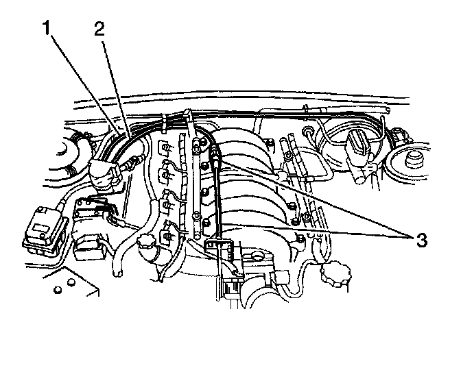 3. Attach the throttle cable (3) to the retaining clip over the intake manifold.