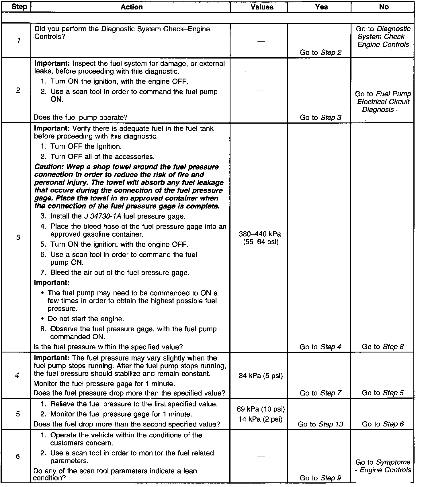 4. This step tests that the fuel system can maintain fuel pressure with the pump Off. A fuel pressure drop of more than 34 kPa (5 psi) within the specified time indicates a leak in the fuel system.