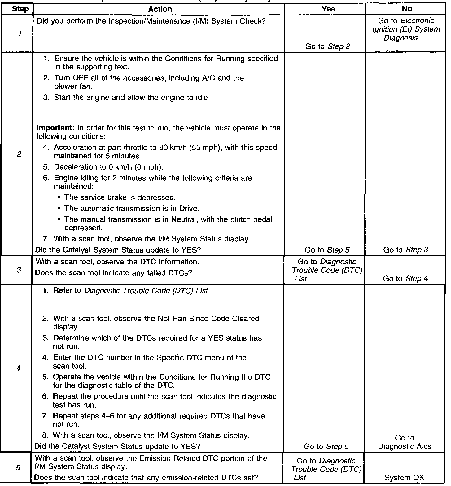 3. This step is to identify a first failure of a type B DTC. A DTC only appears on the I/M System Status display when the DTC becomes a MIL-illuminating DTC. This occurs on the second failure of a type B DTC. A first failure of a type B DTC will not allow the I/M System Status to update to YES.