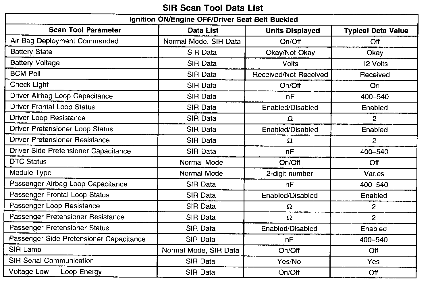 SCAN TOOL DATA LISTThe SIR Scan Tool Data List contains all the restraint system related parameters that are available on the scan tool. The parameters in the list are arranged in alphabetical order. The column, "Data List," indicates the location of the parameter within the scan tool menu selections.