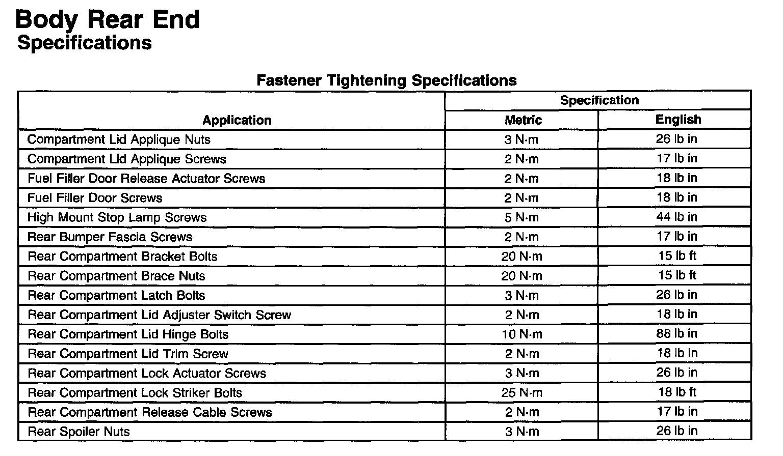 Body Rear End Fastener Tightening Specifications: