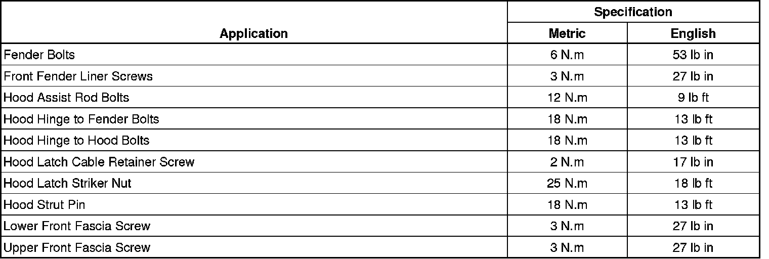 Body Front End Fastener Tightening Specifications: