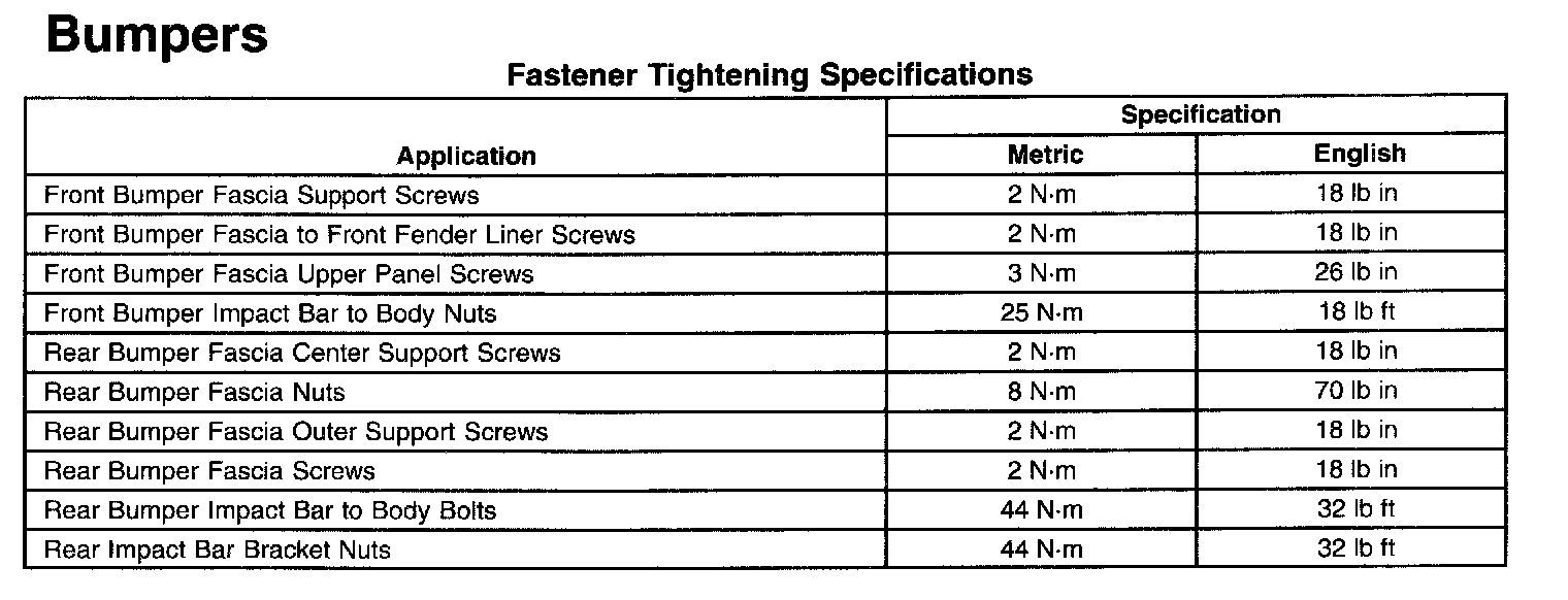 Bumper Fastener Tightening Specifications: