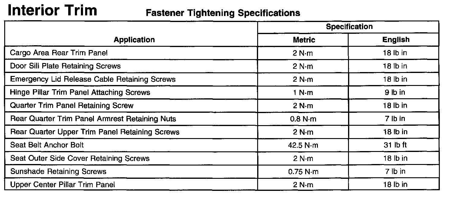 Interior Trim Fastener Tightening Specifications: