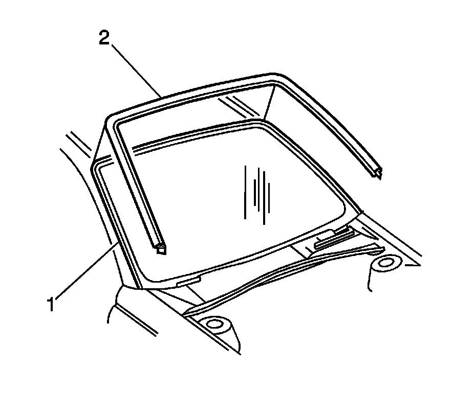 Important: The windshield reveal molding (2) is a one piece molding and fills the cavities between the body and windshield (1). If the windshield reveal molding (2) is stretched or damaged it can not be reused.