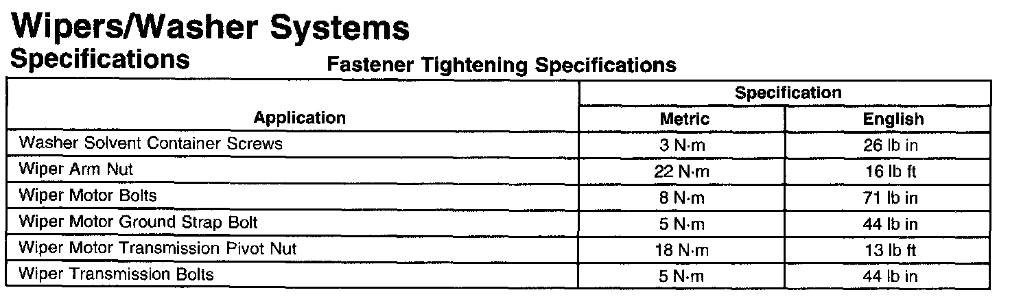Wipers/Washers Systems Fastener Tightening Specifications:
