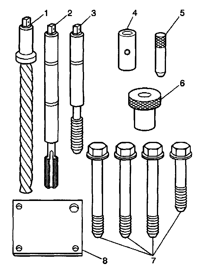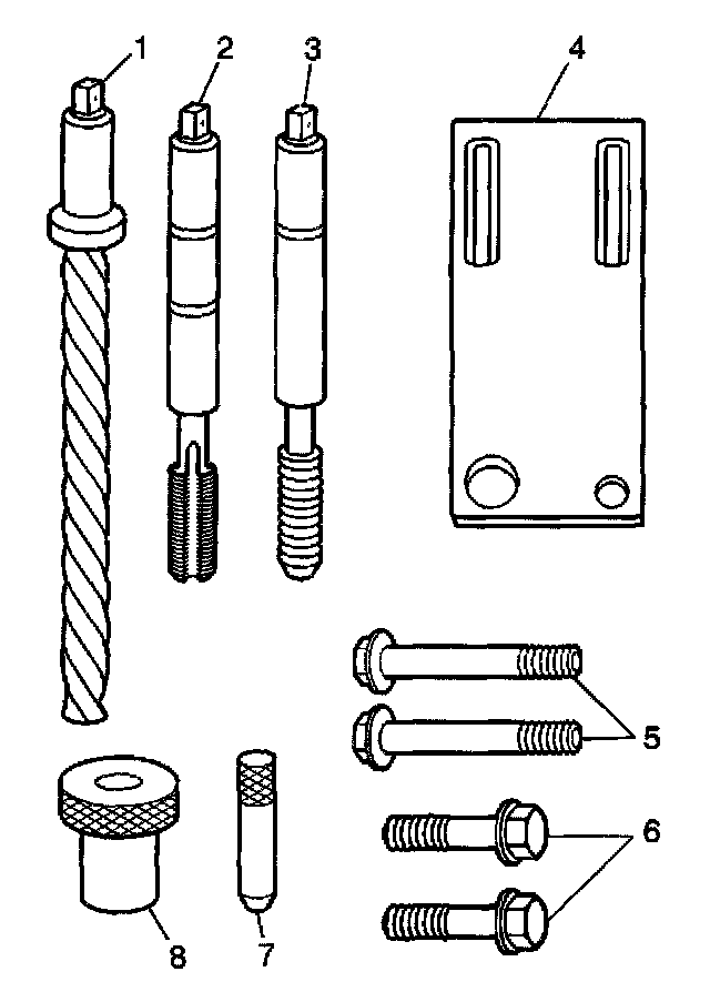 Important: The use of a cutting type fluid GM P/N 1052864 (Canadian P/N 992881), WD 40 (R), or equivalent, is recommended when performing the drilling, counterboring, and tapping procedures. Driver oil MUST be used on the installer driver tool. The tool kits are designed for use with either a suitable tap wrench or drill motor.