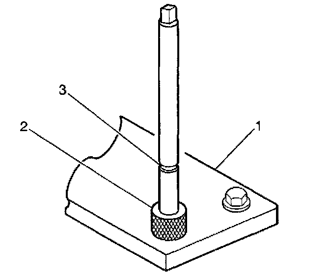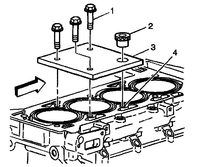2. Install the fixture plate (3), bolts (1), and bushing (2) onto the engine block deck. Position the fixture plate and bushing over the hole that is to be repaired (4).