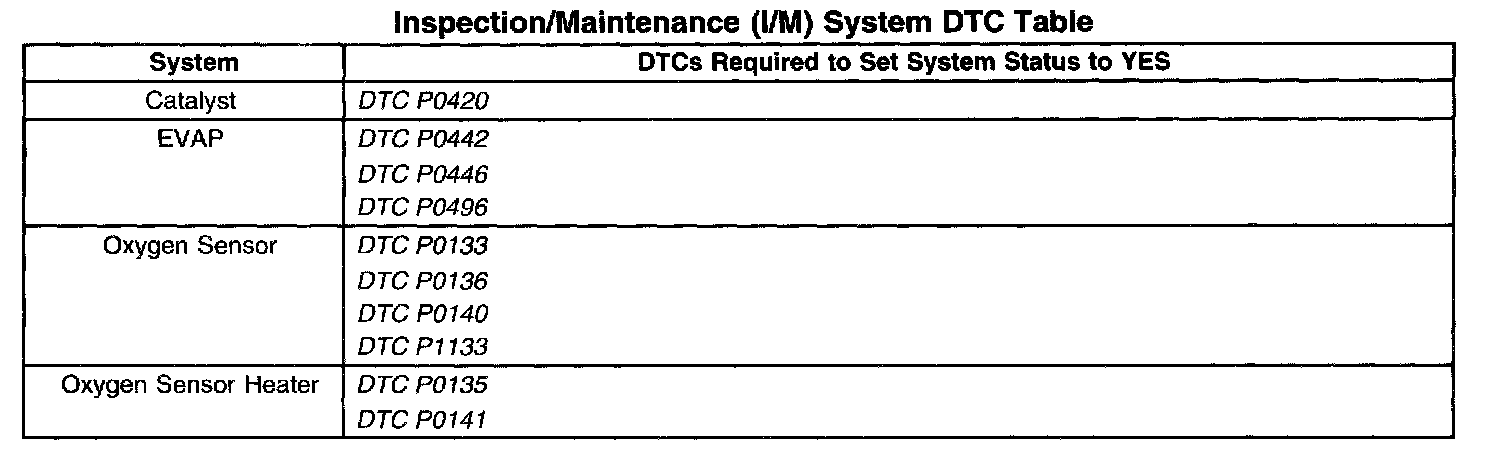 Inspection/Maintenance (I/M) System DTC Table: