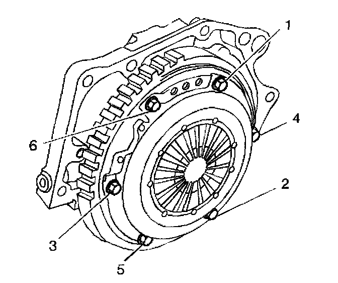 Install the clutch cover to flywheel bolts (1, 2, 3, 4, 5, 6).