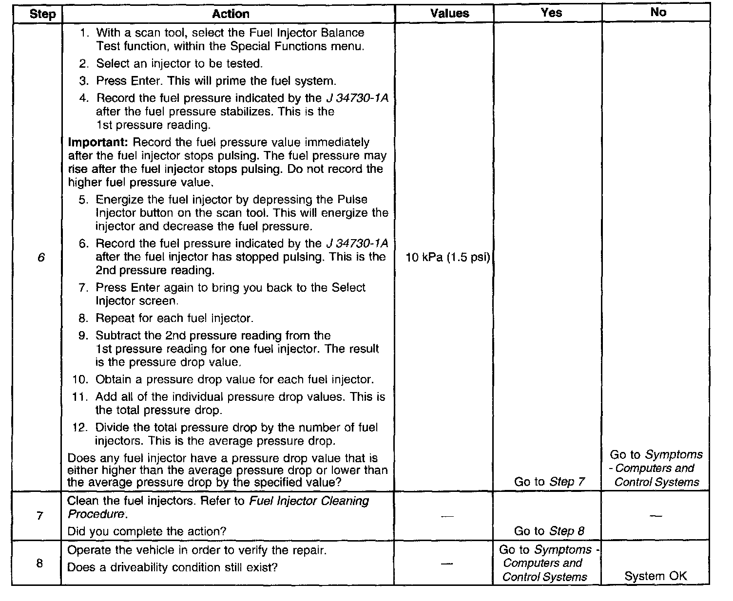 6. If the pressure drop value for each fuel injector is within 10 kPa (1.5 psi) of the average pressure drop value, the fuel injectors are flowing properly.