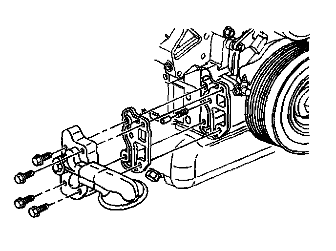 6. If replacing the engine front cover, install the pressure relief valve, the oil filter adapter and the oil filter adapter bolts to the engine front cover. Tighten