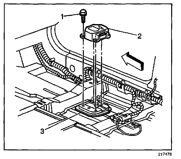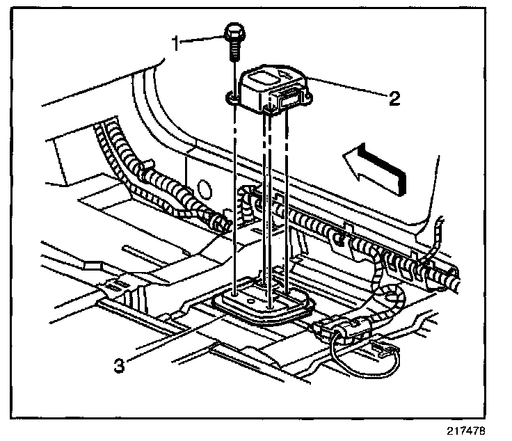 11. Remove the SDM (2) from the floor pan (3).