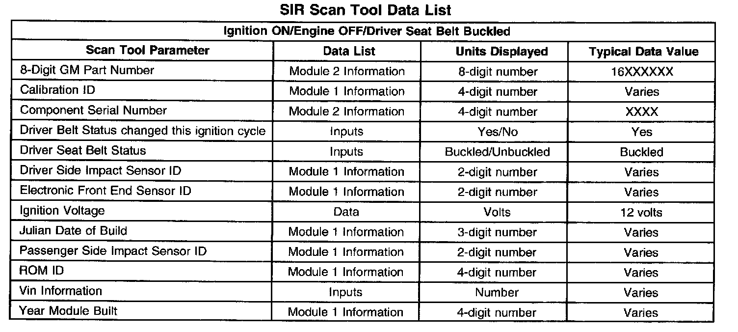 Use the SIR scan tool data list as directed by a diagnostic table or in order to supplement the diagnostic procedures. Begin all of the diagnostic procedures with the Diagnostic System Check - Restraint Systems. Use the SIR Scan Tool Data List after the following is determined: