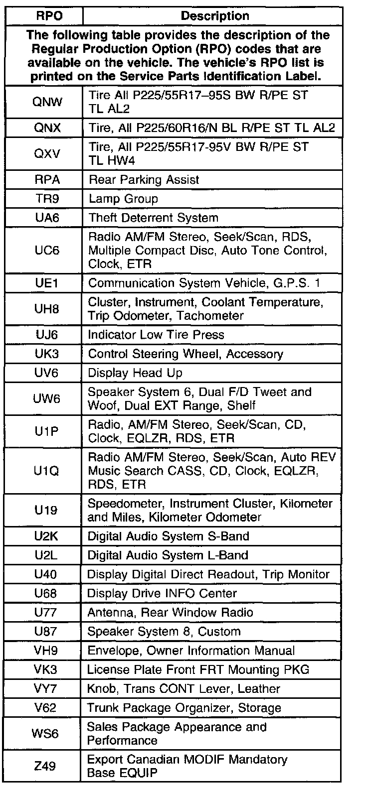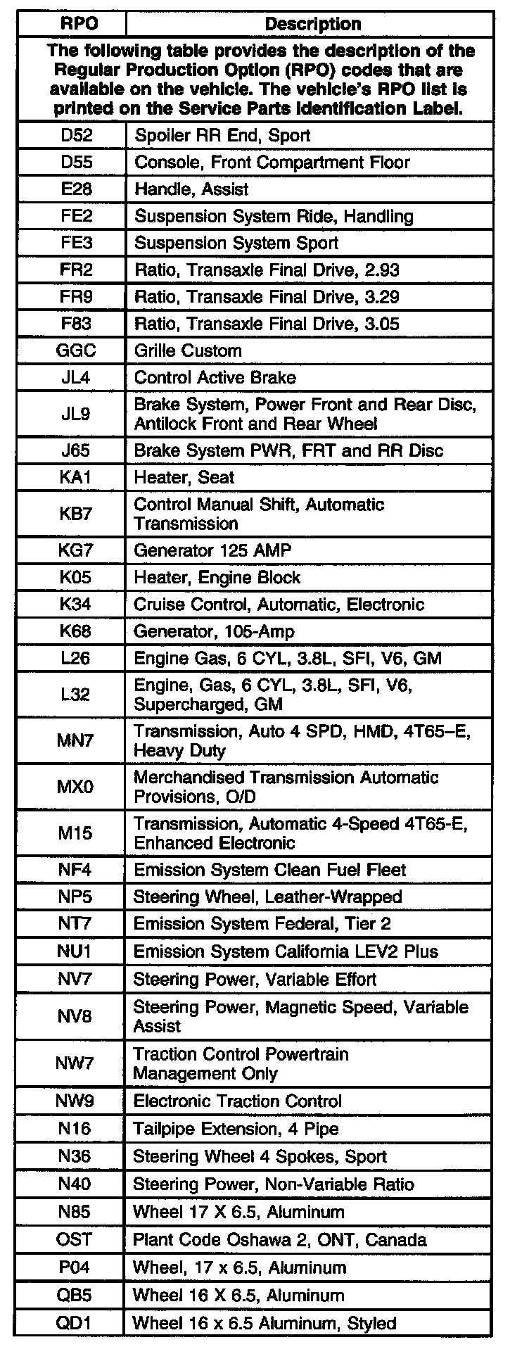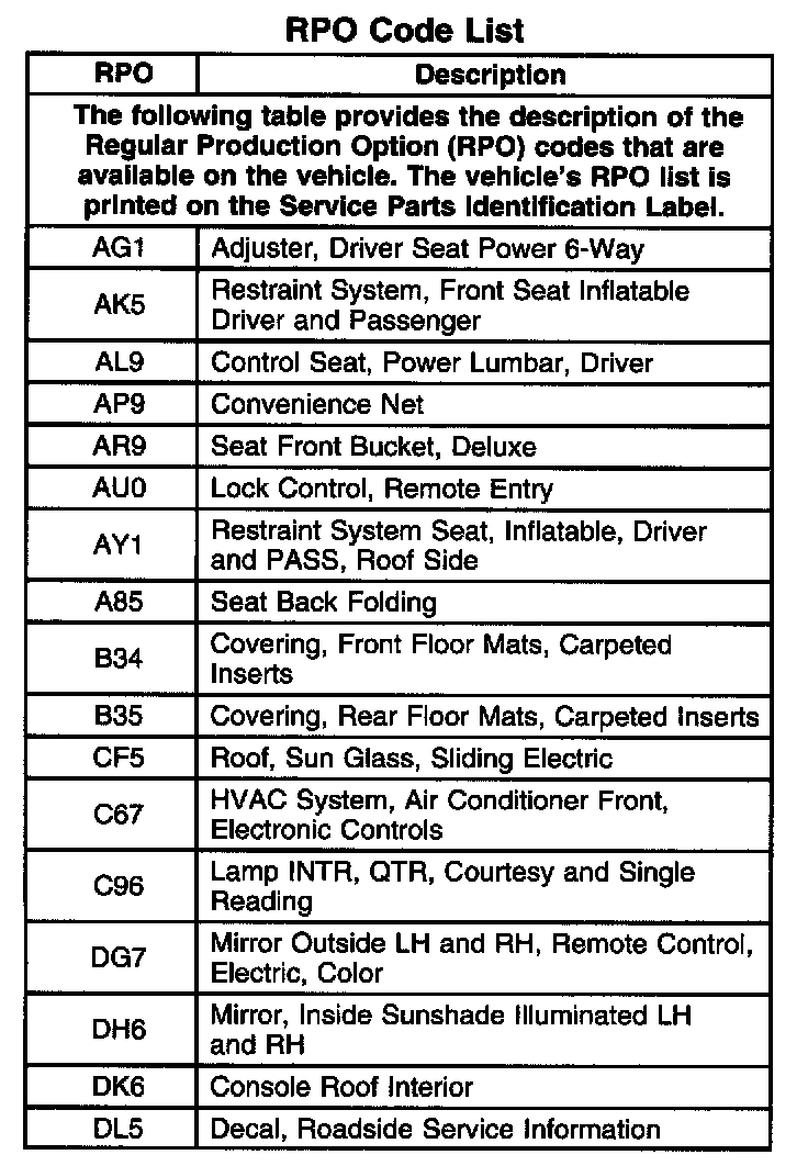 RPO Code List Part 1:
