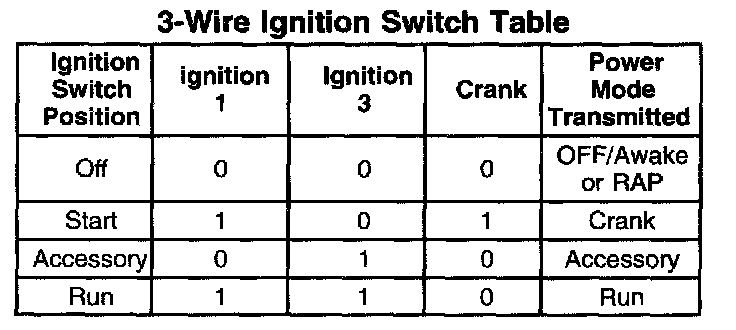 On vehicles that have several control modules connected by serial data circuits, one module is the power mode master (PMM). On this vehicle the PMM is the BCM. The PMM receives 3 discrete ignition switch signals to differentiate which power mode will be sent over the Serial Data circuits. The table illustrates the state of these inputs in correspondence to the ignition switch position.