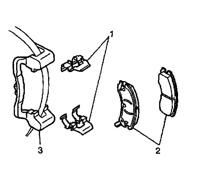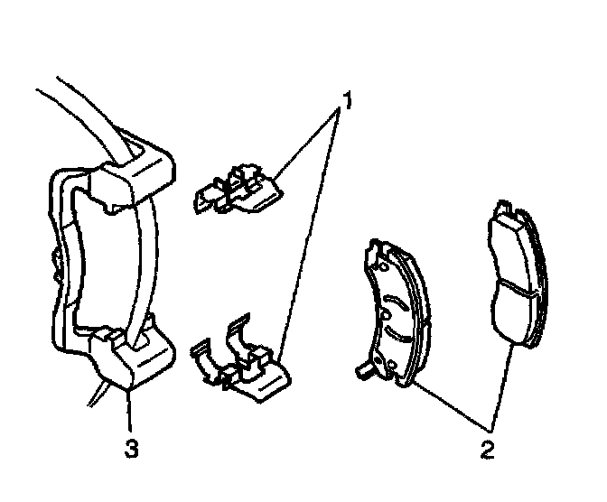 3. Remove the brake pad retainers (1) from the brake caliper bracket (3).
