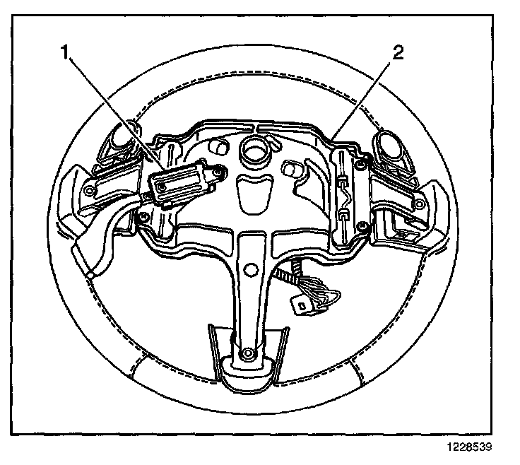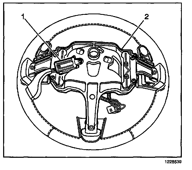 8. Remove the cruise control switch (1) from the steering wheel (2).