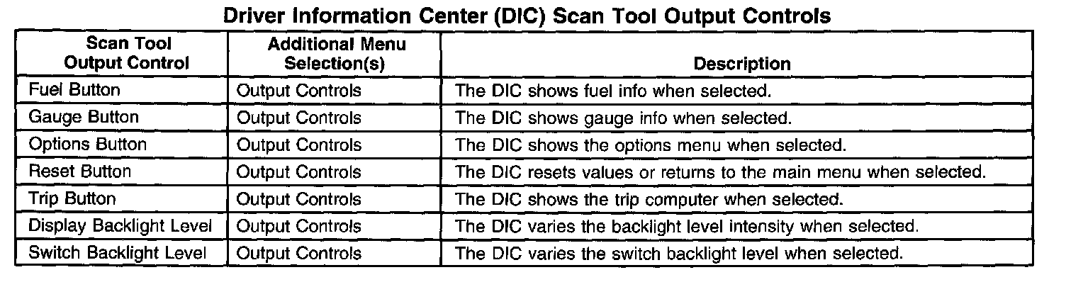 Driver Information Center (DIC) Scan Tool Output Controls: