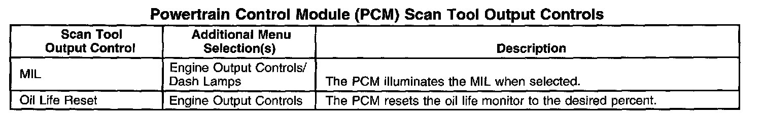 Powertrain Control Module (PCM) Scan Tool Output Controls: