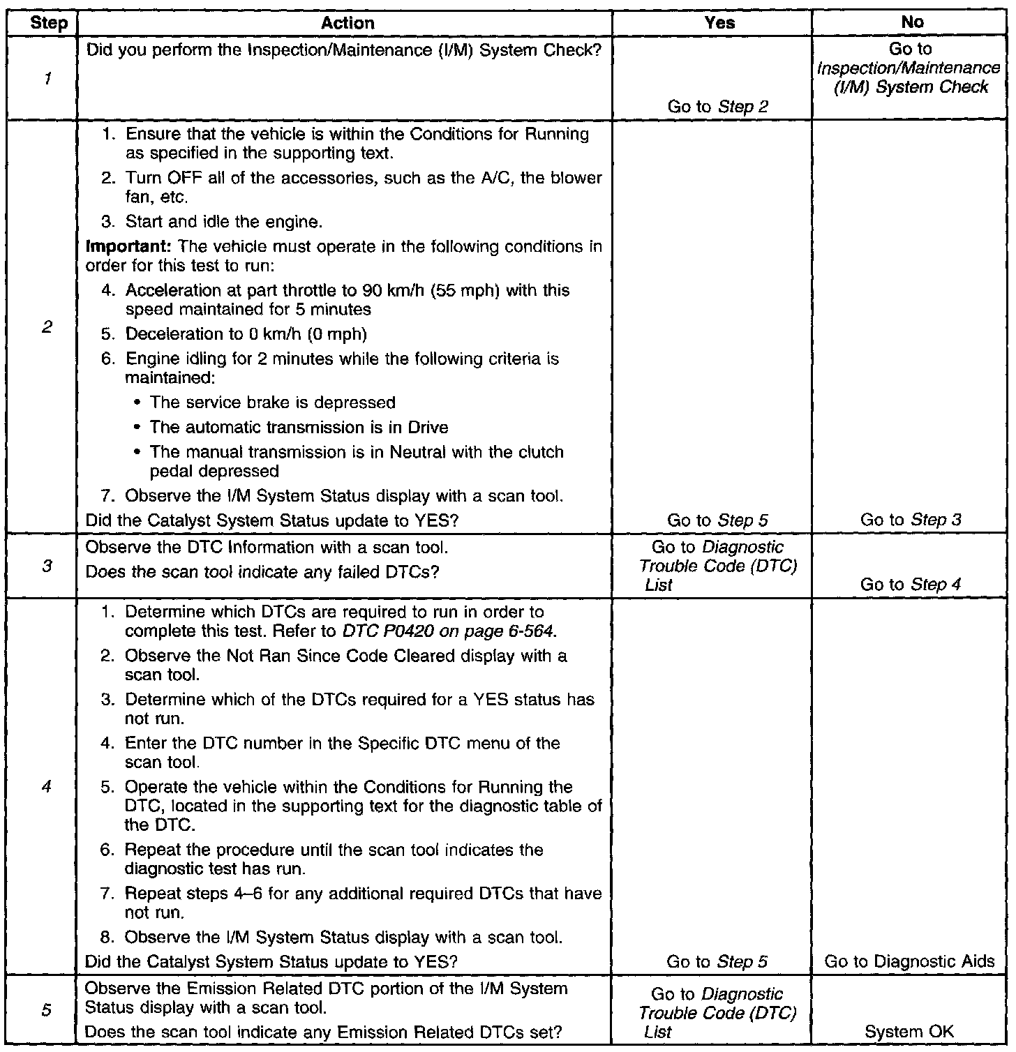 3. This step identifies a first failure of a type B DTC. A DTC only appears on the I/M System Status display when the DTC becomes a MIL illuminating DTC. This occurs on the second failure of a type B DTC. A first failure of a type B DTC will not allow the I/M System Status to update to YES. Refer to Diagnostic Aids.