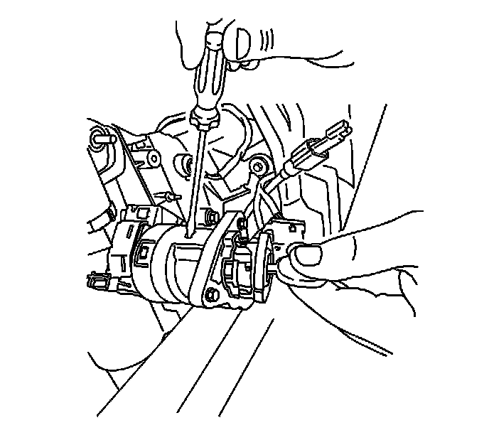 10. Depress and hold the detent on the bottom of the ignition switch in order to release the ignition lock cylinder. Remove the ignition lock cylinder with the key.