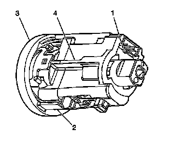 2. Slide the theft deterrent reader/exciter module (3) onto the ignition lock cylinder housing. Verify that the retainers (1,2) are engaged.