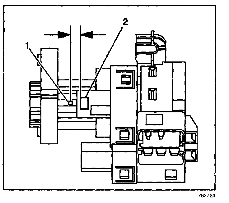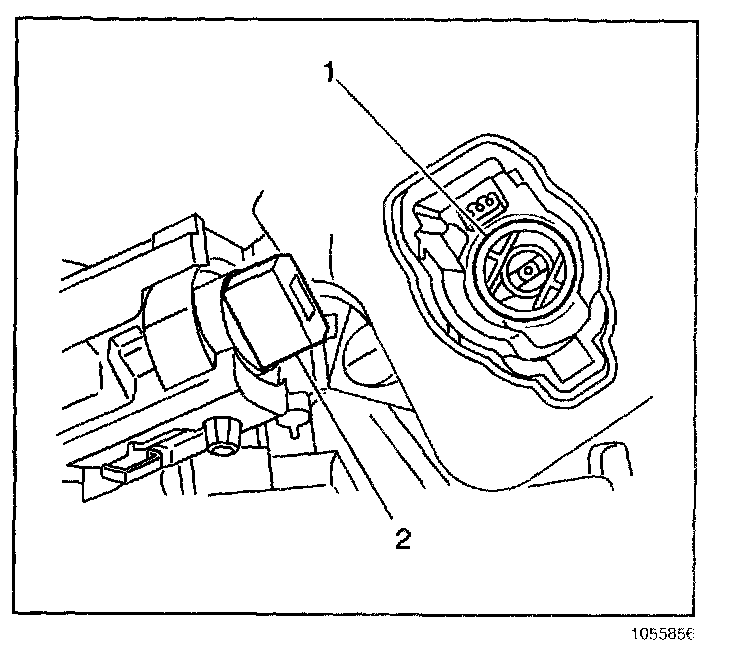 15.2. Locate the surface for the release button (2) for the ignition switch lock cylinder on the plastic ignition switch housing. Center punch a location (1) on the rib approximately 3/8 inch reward, toward the key entry end, from the cylinder release button.