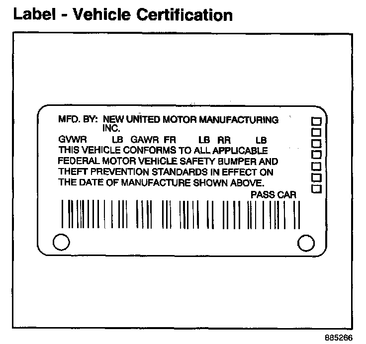 The vehicle certification label is permanently located on the drivers door lock pillar. Refer to this label in order to obtain the following information: