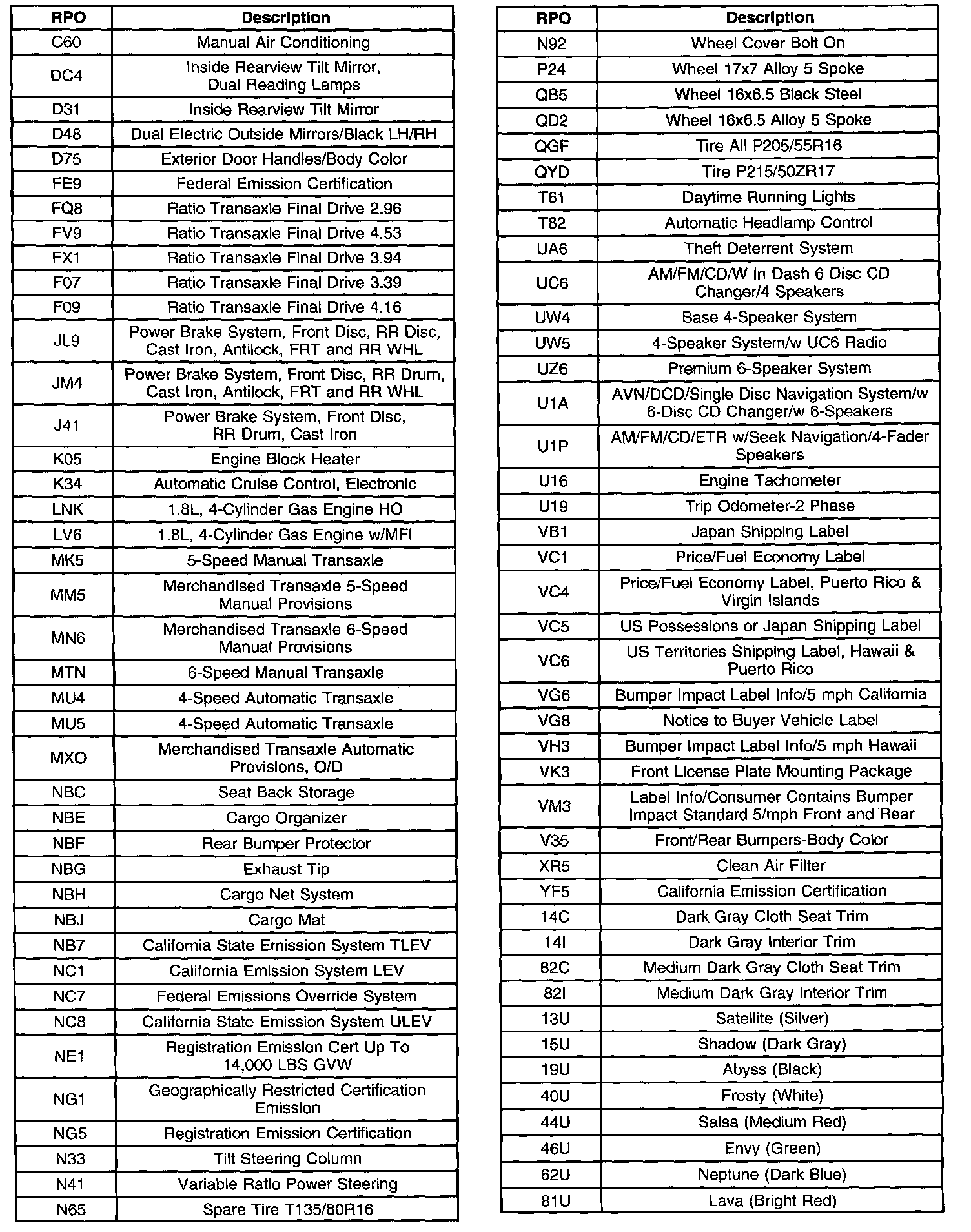 RPO Codes
