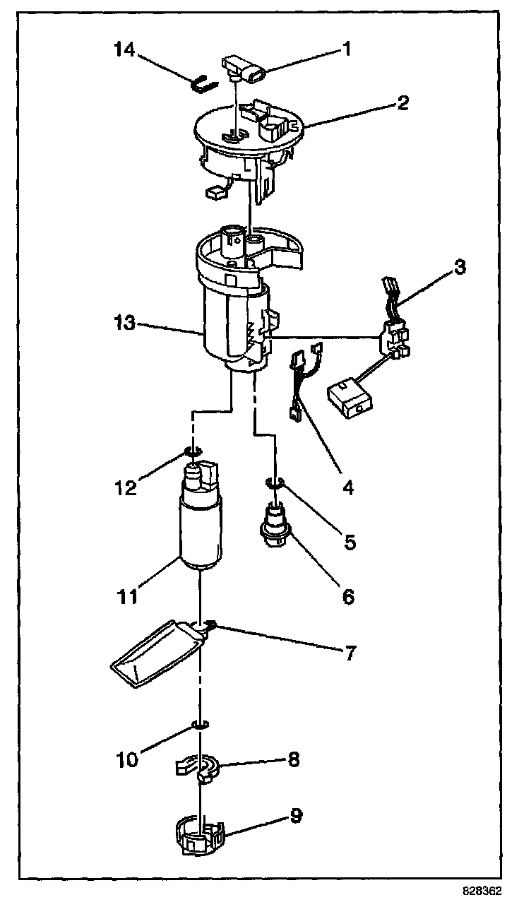 3. Install the fuel pump (11) in to the fuel filter assembly (13).
