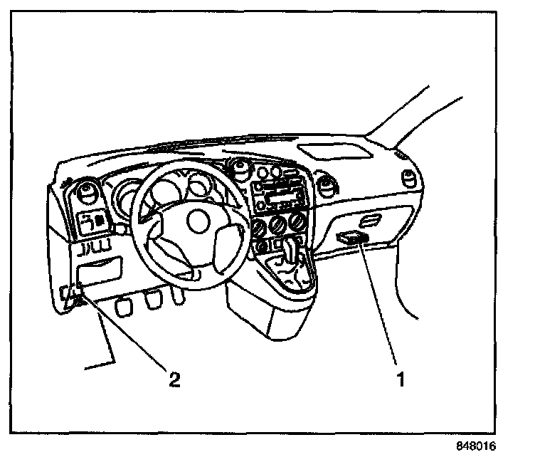 The powertrain control module (PCM) is a precision 32-bit microprocessor and is an essential part of the electronic control system. The PCM (1) is located below the instrument panel (IP) storage compartment. Communication with the PCM is through the data link connector (2) located on the left side below the IP. The PCM performs the OBD II diagnostic tests of the emission related systems. The PCM supplies a buffered voltage, called reference voltage, to the various information sensors and switches. The PCM controls most components with an electronic switch that completes a ground circuit when turned ON. The electronic switch is commonly referred to as an output driver. The PCM is also responsible for a self-diagnosis function and a fail-safe function.