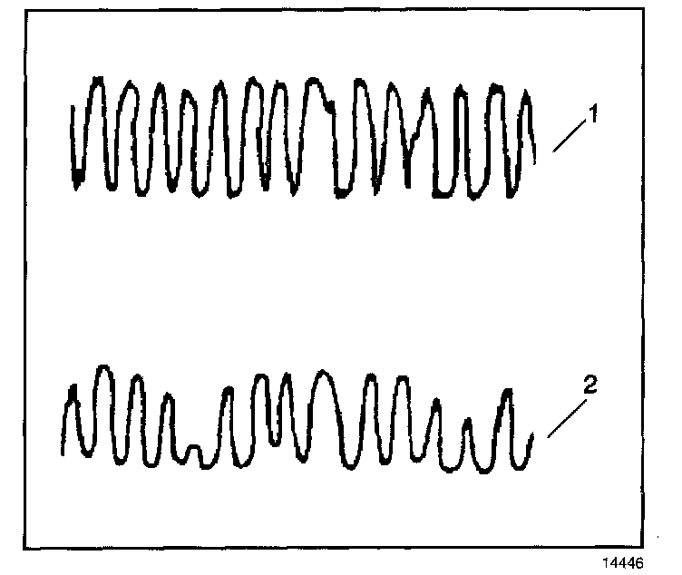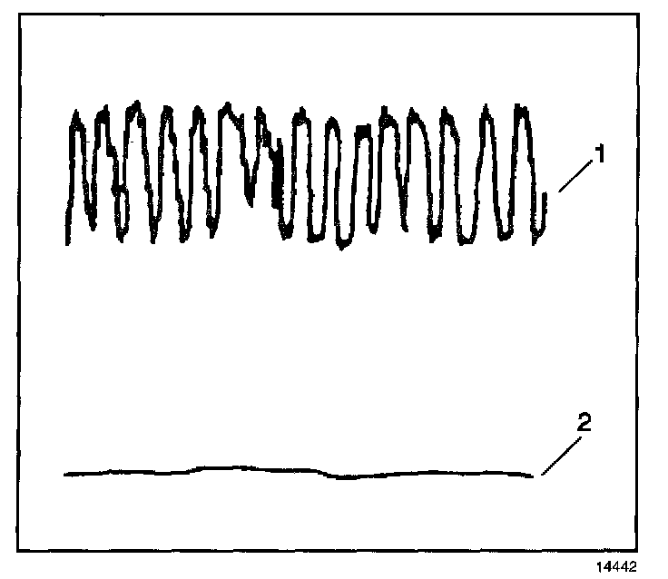 A good TWC catalyst will show a very active output voltage on the pre-catalyst heated oxygen sensor (1). A good catalyst, 95 percent hydrocarbon conversion, will show a relatively flat output voltage on the post-catalyst heated oxygen sensor (2).