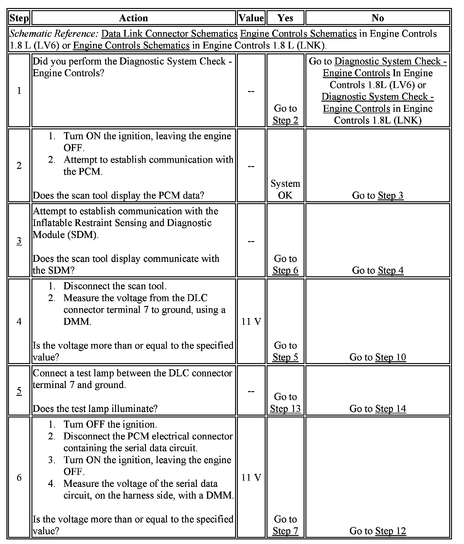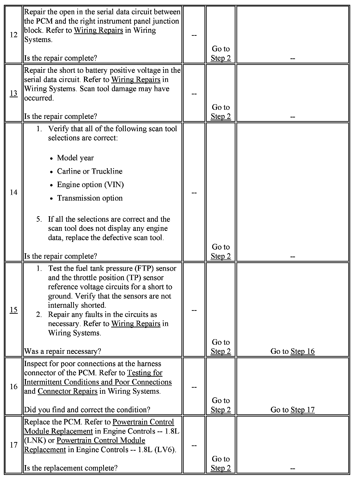 13. The scan tool may be damaged by high current flow on the serial data circuit at DLC terminal 7. Inspect the scan tool for proper operation on a known good vehicle that uses terminal 7 of the DLC for serial data communication.