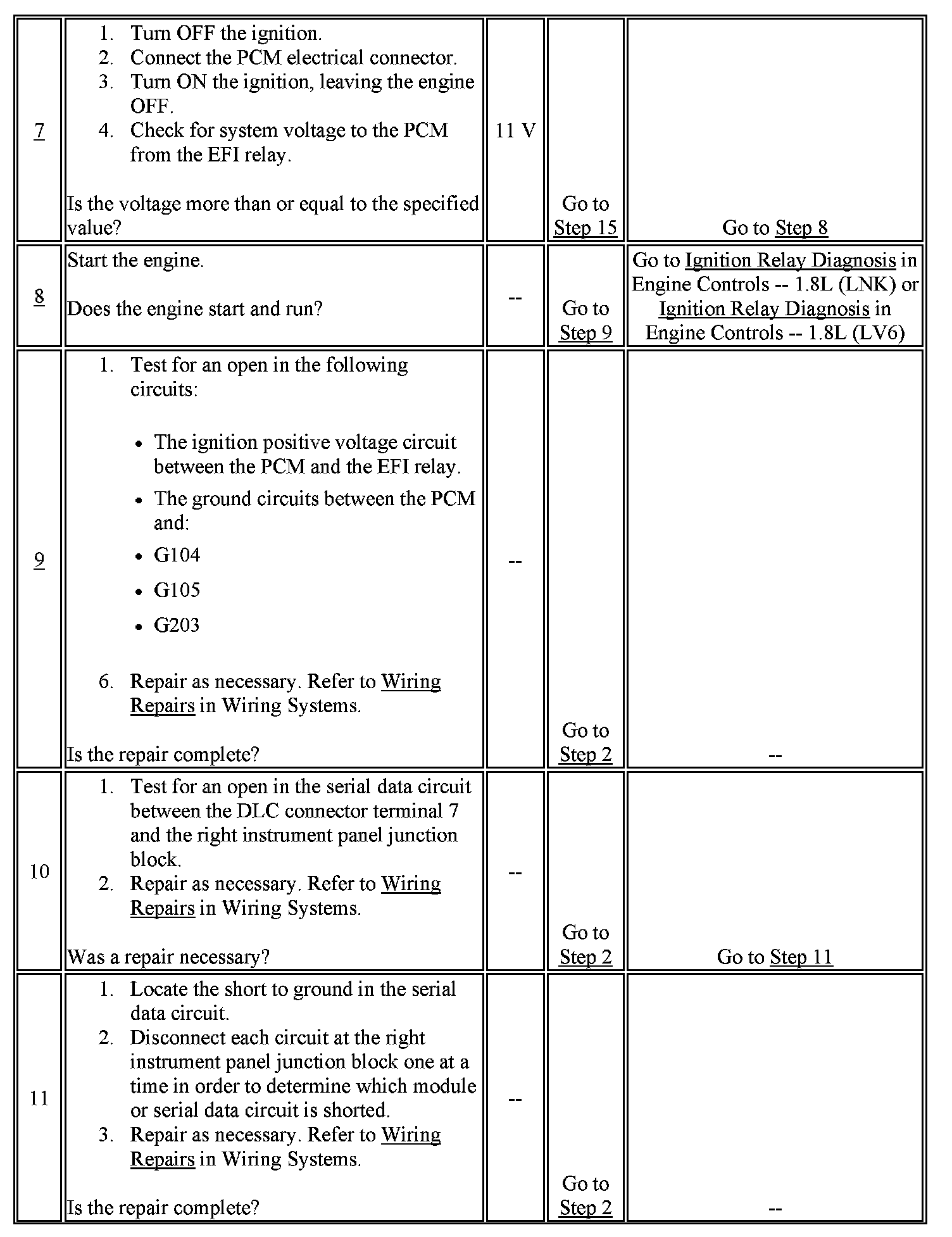 7. This step checks whether the PCM is receiving ignition positive voltage from the EFI relay when the ignition is ON. The PCM cannot provide serial data without ignition positive voltage from the EFI relay.