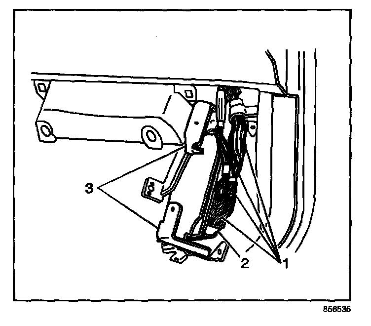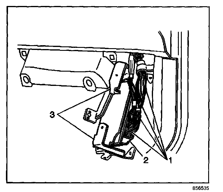 4. Swing the PCM (2) with bracket (3) up in position under the IP.