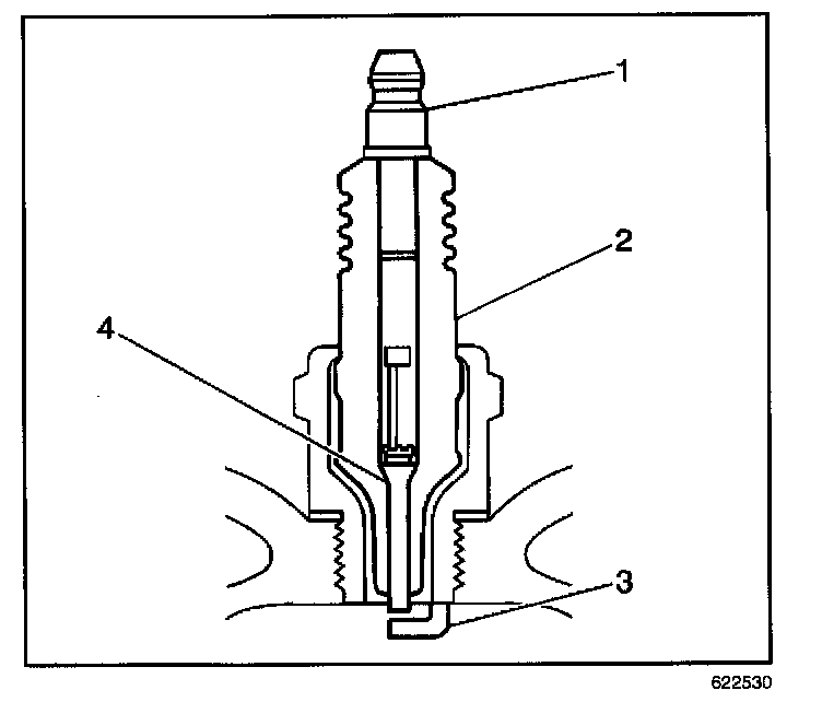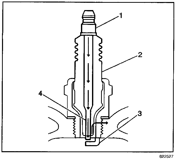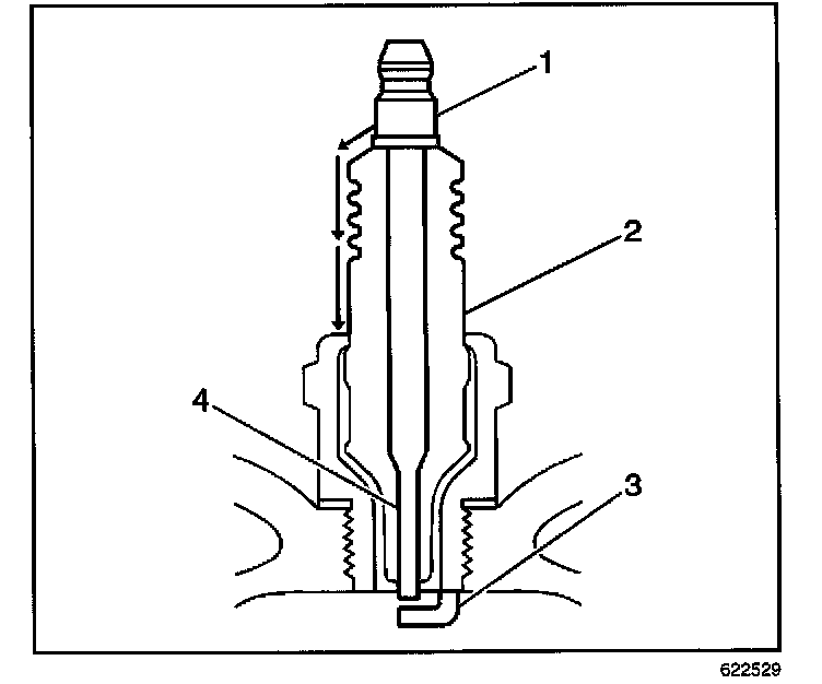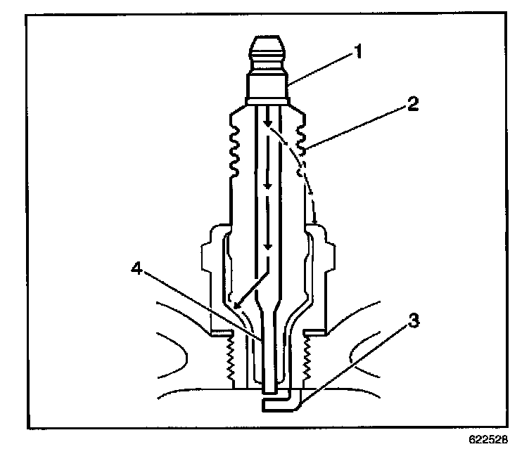 - Inspect the insulator (2) for cracks. All or part of the electrical charge may arc through the crack instead of the electrodes (3, 4).