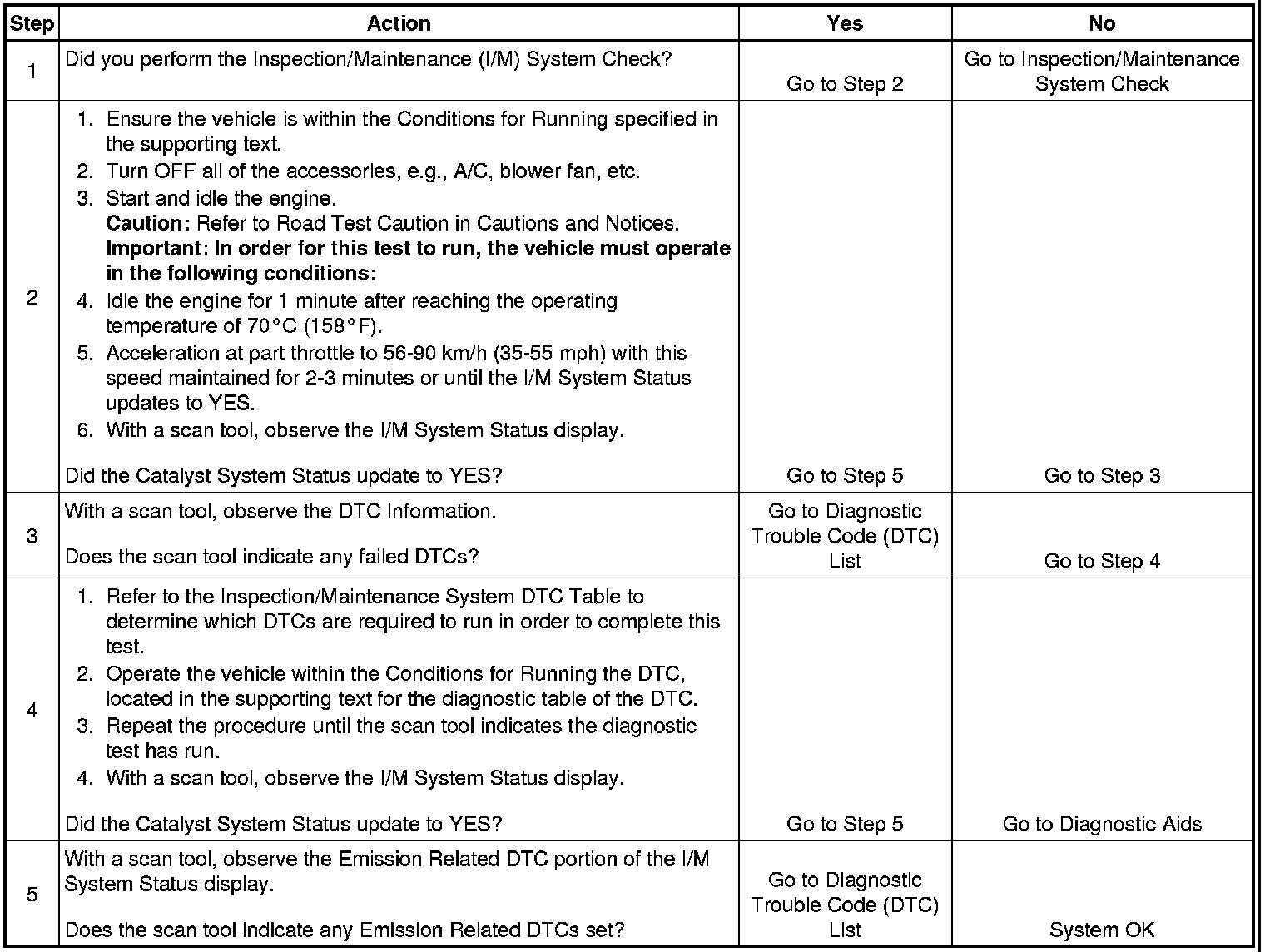 5. The I/M System Status only reports on whether or not a diagnostic has run, not what the outcome of the test was. If any Emission Related DTC sets after the tests are complete, the DTC will require diagnosis.