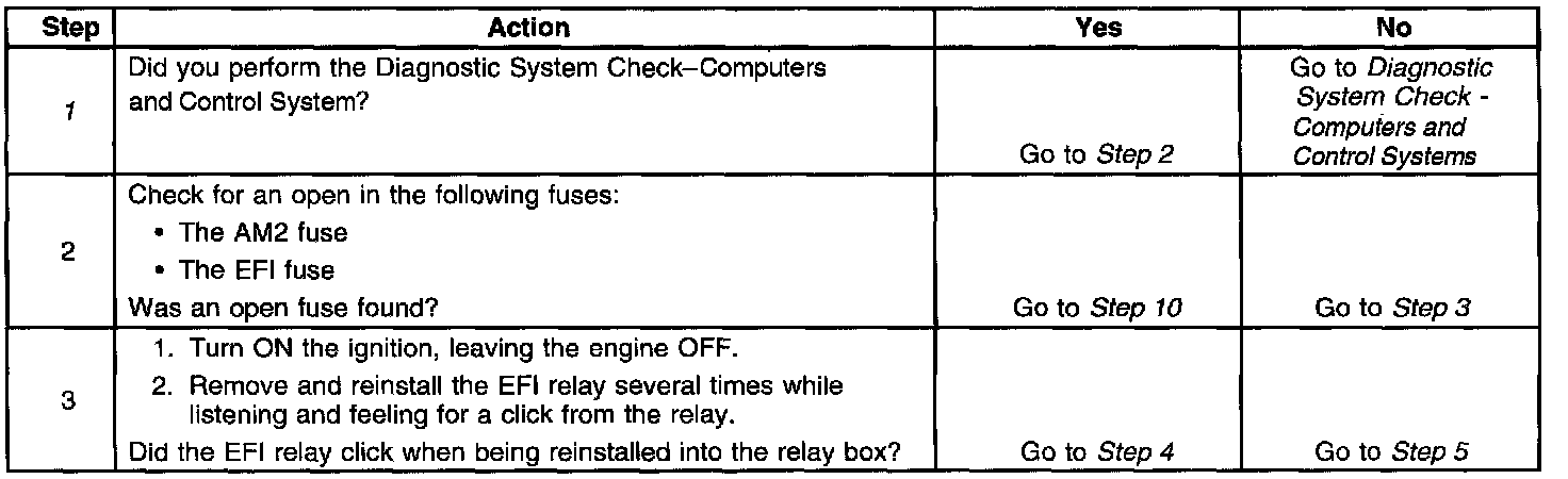 An intermittent malfunction may be caused by a fault in the EFI relay electrical circuit. Inspect the wiring harness and components for an intermittent condition. Refer to Intermittent Conditions. Intermittent Conditions
