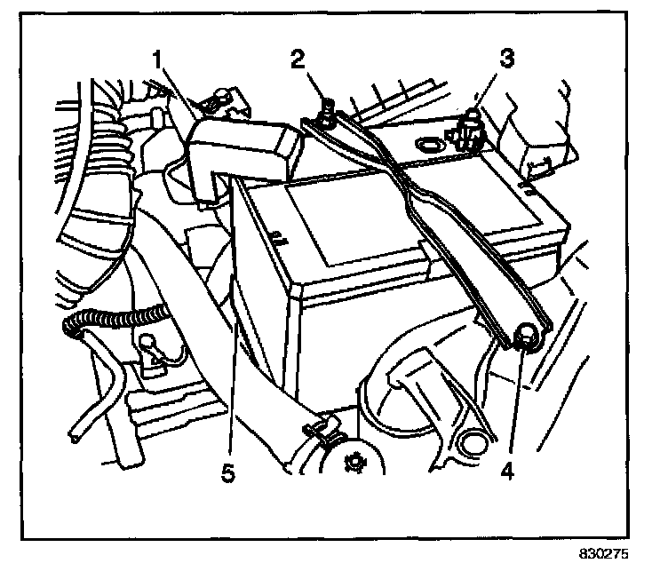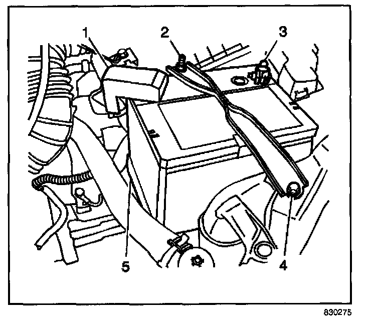 1. Install the battery (5) into the vehicle. Position the battery into the carrier.