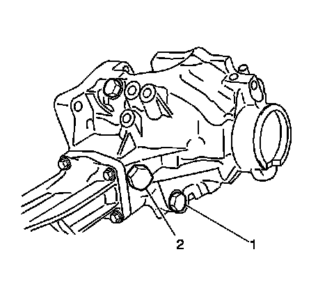 13. Add approximately 0.8 liters (1.7 pints) of 80W-90 API GL5 lubricant, or the equivalent, into the transfer case oil level/filler plug hole. The oil level should be even with the bottom of the oil level/filler plug hole (2).