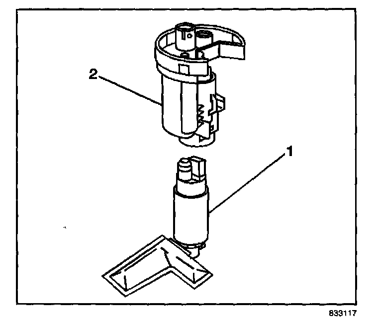 8. Remove the fuel pump (1) from the fuel filter assembly (2).