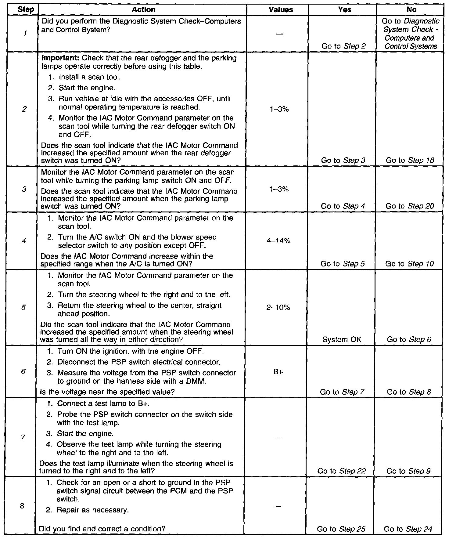 5. This step verifies the operation of the power steering pressure (PSP) switch circuit. If the engine idle speed and IAC Motor Command increase when the steering wheel is turned to 90 percent, the PSP switch idle circuit is functioning normally.