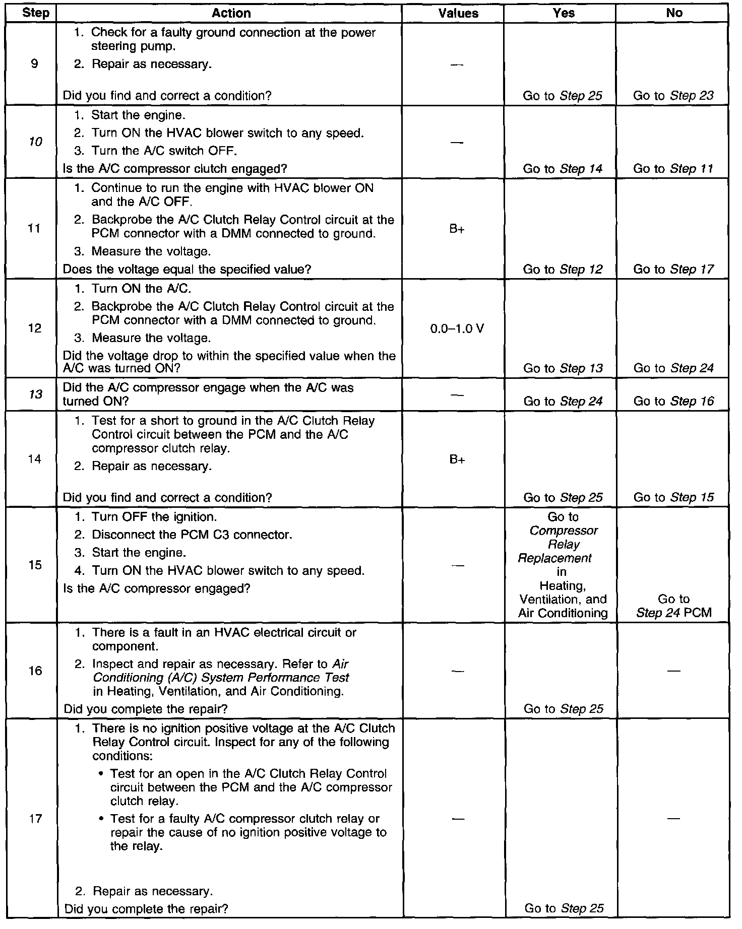 13. If the A/C compressor clutch engages, the compressor clutch, the relay, and the control circuit are all OK. The PCM will then need to be replaced because there was no increase in the IAC motor command percentage during A/C operation in Step 4.