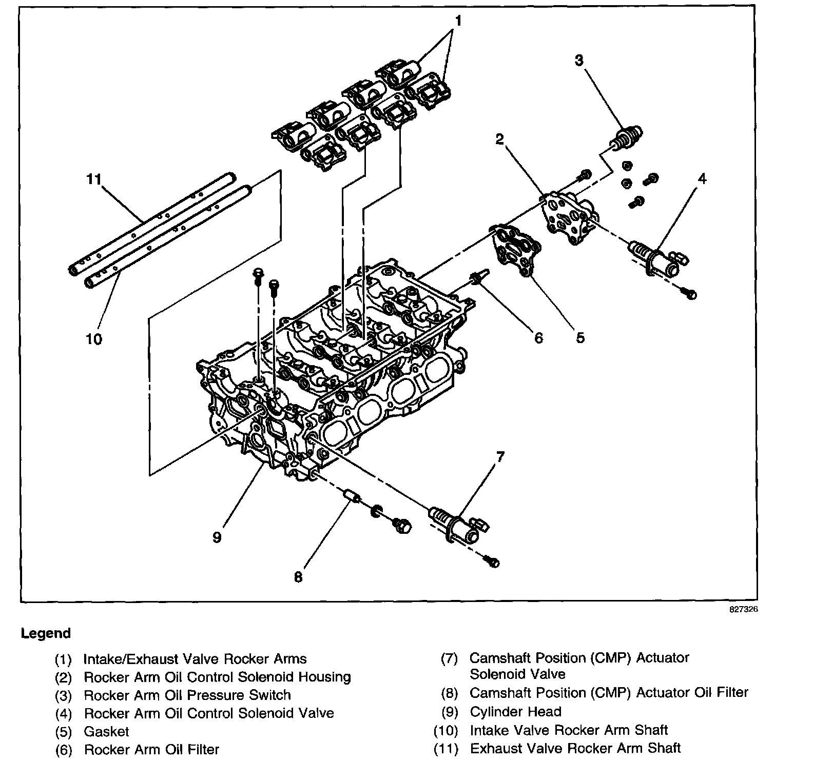 The rocker arms (1) ride on rocker arm shafts (10, 11) that supply engine oil, that is under pressure, to the rocker arms. The flow of engine oil to the rocker arms and shafts is controlled by the rocker arm oil control solenoid valve (4). A rocker arm oil pressure switch (3) signals the PCM when oil pressure is detected. A screen type oil filter (6) is located in the oil supply passage to the rocker arm shafts. The rocker arm oil control solenoid (4) and the oil pressure switch (3) are located in the oil control housing (2).