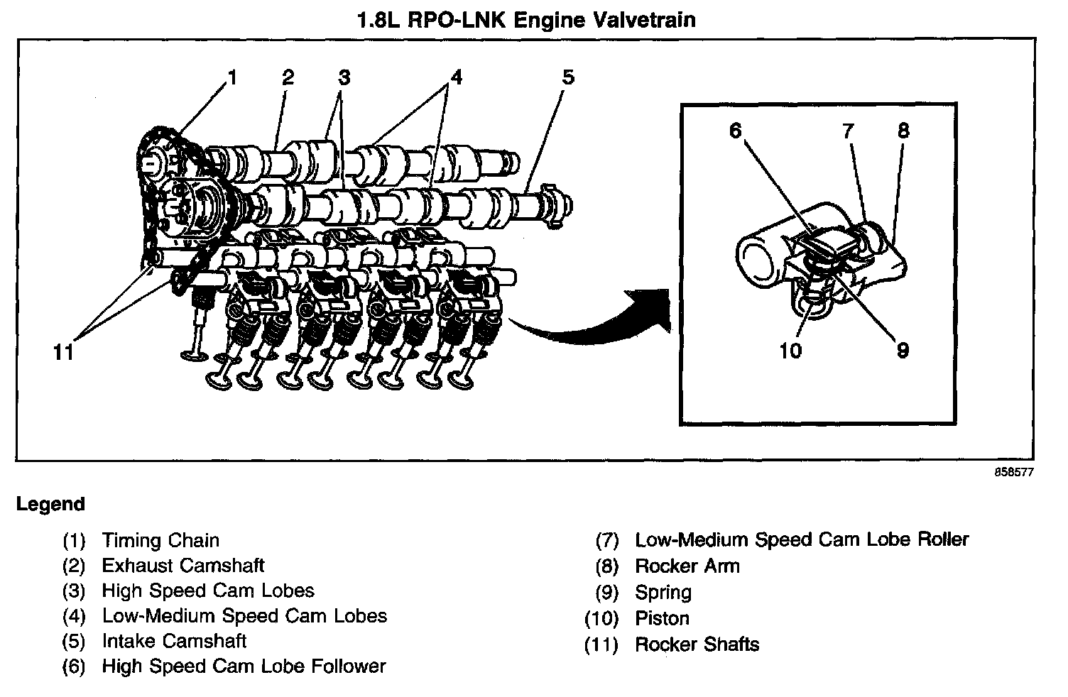 ROCKER ARM OIL CONTROL SYSTEM DESCRIPTIONThe high output 1.8L RPO-LNK engine has a high speed cam system that increases engine output between 6,000-8,200 RPM. The increase in power is possible because valve lift is significantly increased at engine speeds above 6,000 RPM. A second camshaft lobe with a high lift profile is cast into each camshaft, alongside the low/medium speed lobes. In order to use the high speed cam only when desired, the engine utilizes a rocker arm oil control system. The system uses unique rocker arms that are hydraulically operated and electronically controlled.