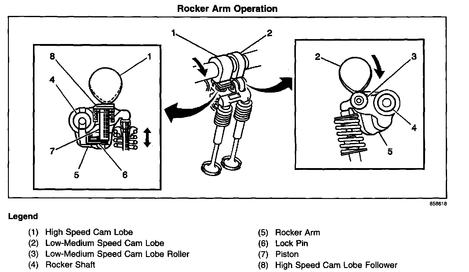 When the rocker arm oil control solenoid turns ON, oil flows from the rocker arm shaft into an oil passage in the rocker arm. The oil passage leads to a spring loaded lock pin (6) that is normally resting beyond the travel of the piston (7). With the solenoid ON, oil flow creates pressure within the rocker arm oil passage and moves the lock pin (6) underneath the piston (7). The piston and cam follower (8) can no longer move away from the cam lobe (1) and the rocker arm now moves with the high lift cam lobe (1).