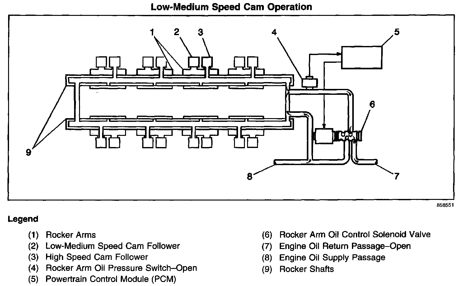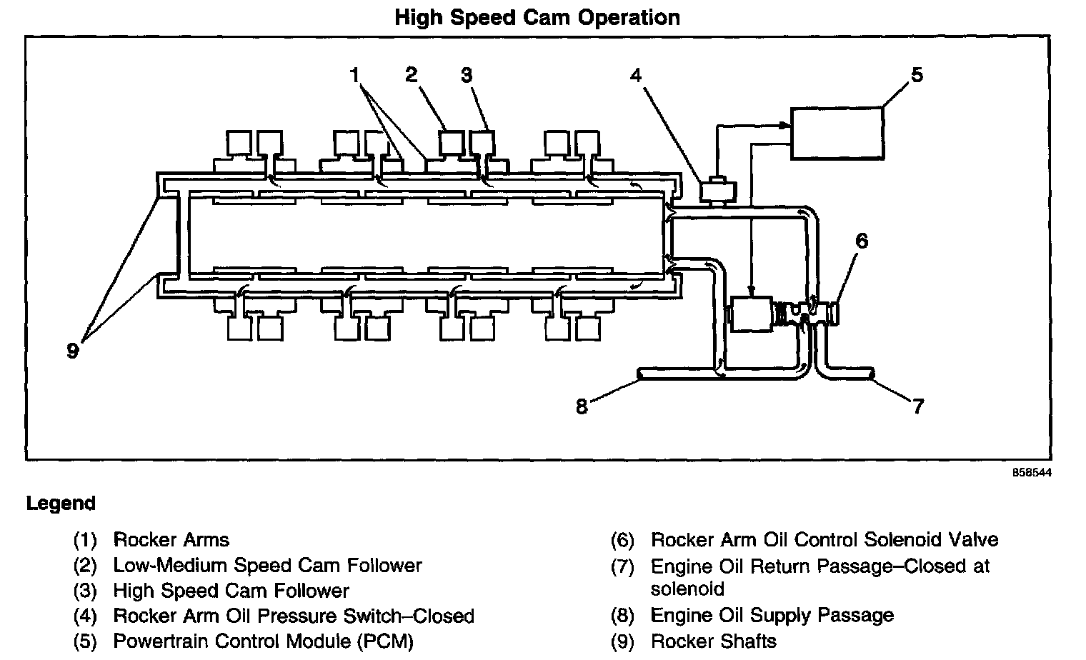 During engine operation below 6,000 RPM, the rocker arms (8) follow the low/medium speed cam lobes (4). When engine oil is allowed to flow unobstructed to the rocker arms, the arms follow the high speed cam lobes (3), increasing valve lift. The flow of engine oil to the rocker arms is controlled by the rocker arm oil control solenoid valve. The solenoid is pulse width modulated (PWM) by the powertrain control module (PCM). The rocker arm oil pressure switch detects oil pressure when the rocker arm oil control solenoid is ON. The oil pressure switch input enables the PCM to monitor the operation of the rocker arm oil control solenoid. The rocker arm oil filter removes dirt and debris from the supply of engine oil to the rocker arm shafts.