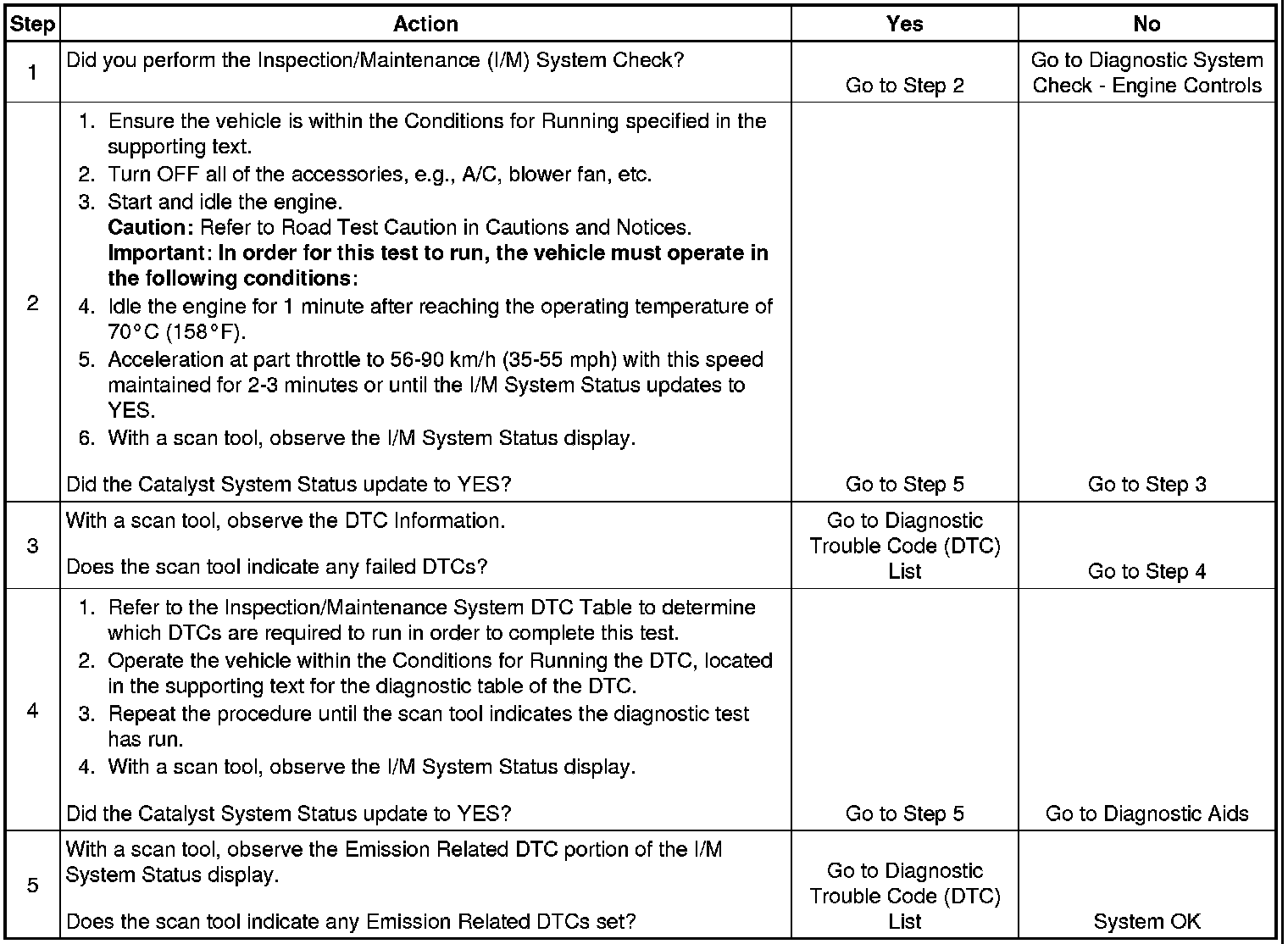 5. The I/M System Status only reports on whether or not a diagnostic has run, not what the outcome of the test was. If any Emission Related DTC sets after the tests are complete, the DTC will require diagnosis.