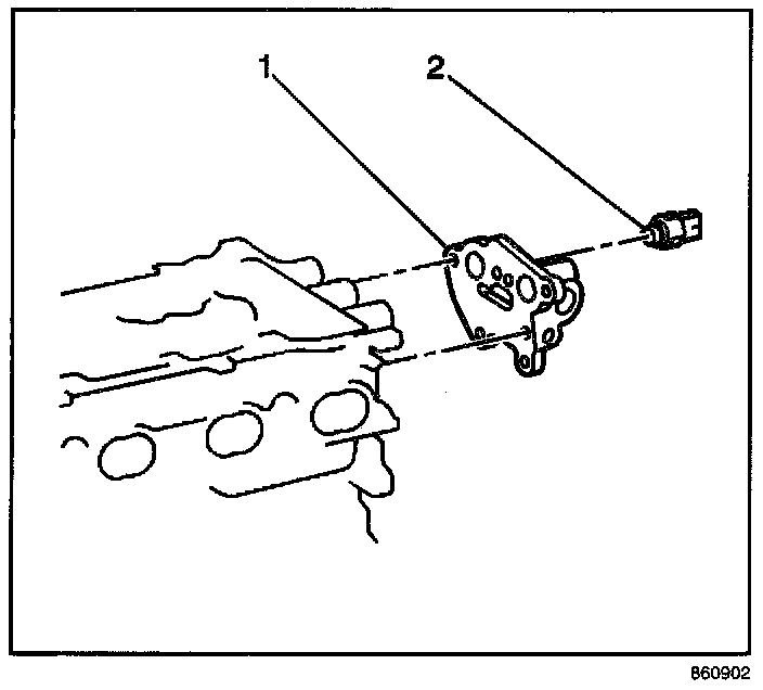 1. Install the the rocker arm oil pressure switch (2) into the rocker arm oil control solenoid housing (1).